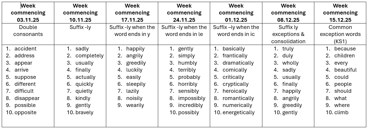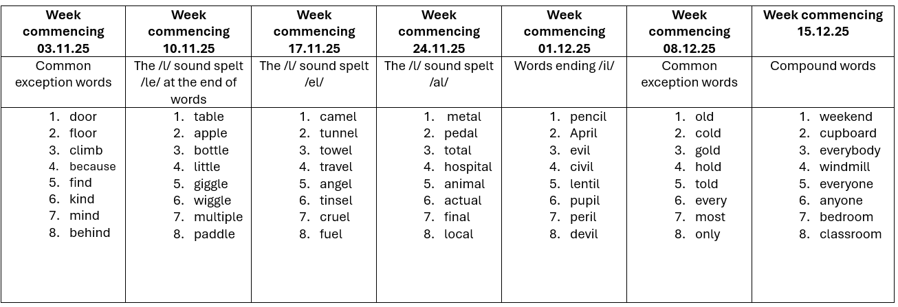 Weeks 1 and 2 spelling tests will be a recap of Year 2 common exception words and pre assessment of Year 3 common exception words. The rest of the half-term will follow the Emile spelling scheme. (See below)