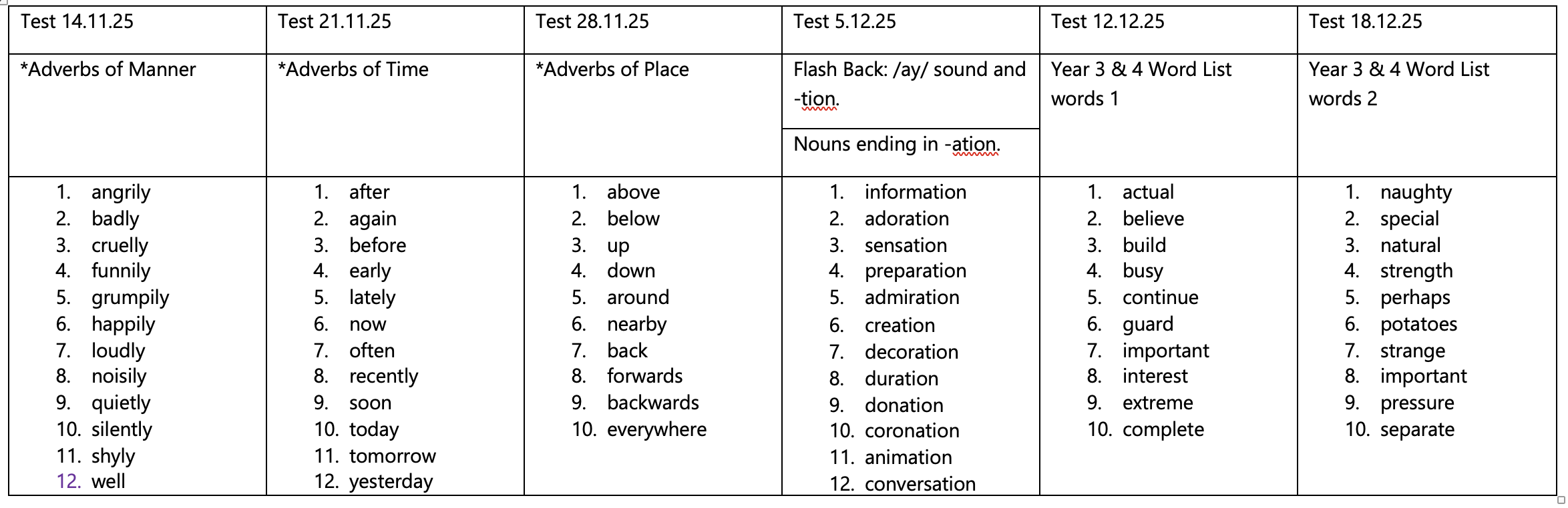 Spellings will be learnt and tested each week. Usually, the lists will be given out each half-term.